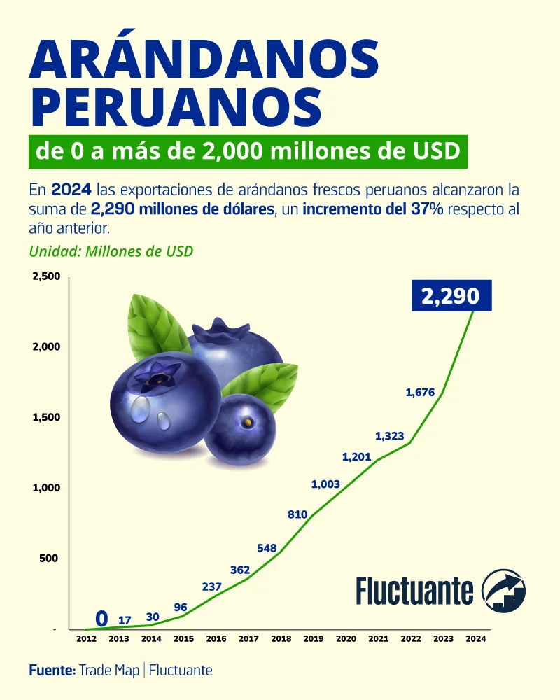 El arándano peruano ha pasado de ser una fruta poco conocida a convertirse en una de las estrellas de la agroexportación mundial. Este pequeño fruto azul, con su sabor dulce y su alto contenido de antioxidantes, ha conquistado mercados internacionales en tiempo récord. En el año 2024, las exportaciones peruanas de arándanos alcanzaron un valor de 2,290 millones de dólares, marcando un impresionante crecimiento del 37% respecto al año anterior.